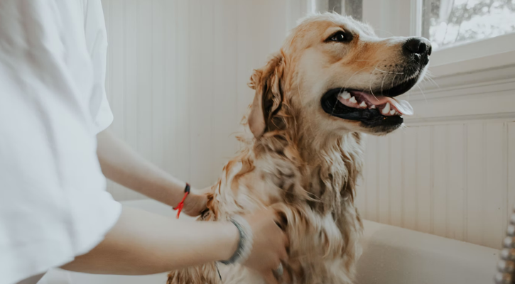 Brush your pet's coat on a regular basis, but avoid excessive bathing. Bathing your pet too often can cause dry and flaky skin.
